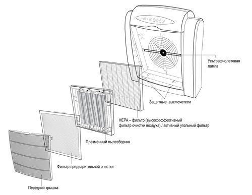 Система фильтрации прибора включает в себя высокоэффективный фильтр HEPA, очистка в котором производится с применением активированного угля. В результате достигается исключительно высокий процент удаления загрязнений из воздуха – из него удаляется до 99,97% частиц, размер которых превышает 0,03 микрон.